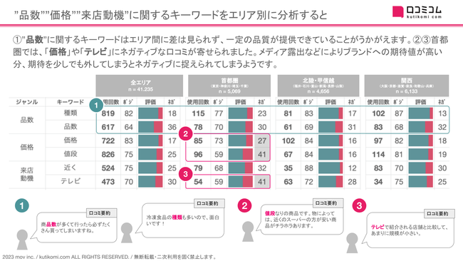 1.”品数”に関するキーワードはエリア間に差は見られず、一定の品質が提供できていることがうかがえます。2.3.首都圏では、「価格」や「テレビ」にネガティブな口コミが寄せられました。メディア露出などによりブランドへの期待値が高い分、期待を少しでも外してしまうとネガティブに捉えられてしまうようです。