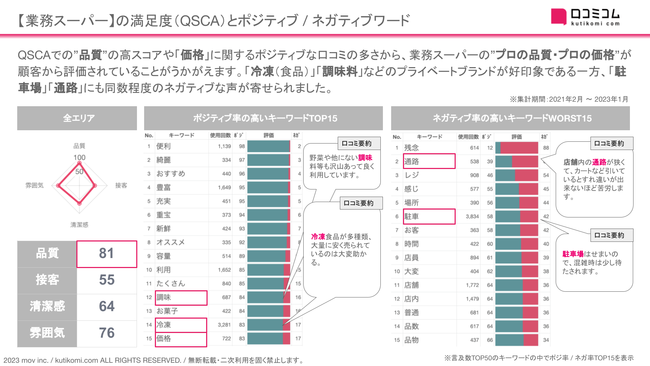 QSCAでの”品質”の高スコアや「価格」に関するポジティブな口コミの多さから、業務スーパーの”プロの品質・プロの価格”が顧客から評価されていることがうかがえます。「冷凍(食品)」「調味料」などのプライベートブランドが好印象である一方、「駐車場」「通路」にも同数程度のネガティブな声が寄せられました。