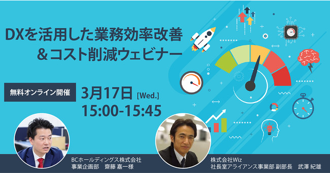 株式会社Wiz(本社:東京都豊島区 、代表取締役社長:山崎 俊、以下「Wiz」)は、全国の中小企業経営者様、教育・管理部門責任者様へ向けたオンラインセミナー『DXを活用した業務効率改善&コスト削減ウェビナー』を3月17日(水)に開催いたします。店舗経営に特化したコンサルティング事業を展開するBCホールディングス株式会社・齋藤 嘉一氏をゲストに迎え、業務効率化やコスト削減をサポートする最新のサービスをご紹介いたします。