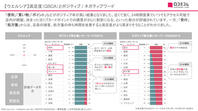 それらのAI解析を用いた分析例として「ウエルシア」のQSCA・頻出ポジネガキーワードを確認しました。