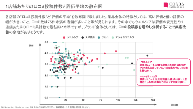 各店舗の”口コミ投稿件数”と”評価の平均”を散布図で表しました。業界全体の特徴としては、高い評価と低い評価の幅が大きいこと、口コミ数は75件未満の店舗が多いこと等が見られます。その中でもウエルシアは評価の安定性や1店舗あたりの口コミ累計数で最も高い水準ですが、ブランド全体としては、口コミ投稿数を増やし分析することで集客改善の余地がありそうです。