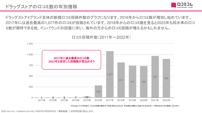 ドラッグストア4ブランド全体の新規口コミ投稿件数のグラフになります。2016年から口コミ数が増加し始めています。2017年には過去最高の1,077件の口コミが投稿されています。2018年からの口コミ数を見ると2023年も同水準の口コミ数が期待できる他、インバウンドの回復に伴い、海外の方からの口コミ投稿が増えるかもしれません。