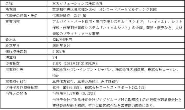当社は、HRソリューションズ株式会社(以下、「HRソリューションズ」という)との間で人材採用領域における共同事業運営に伴う業務提携(以下、「本件業務提携」という)を実施すること、及び本件業務提携をより円滑に推進するために、当社グループが保有するアルバイト求人サイト「シフトワークス」事業(以下、「対象事業」という)に係るソフトウェア資産等をHRソリューションズに会社分割により承継すること(以下、「本件資産承継」という)を2022年7月28日開催の取締役会にて決議いたしましたので、下記の通りお知らせいたします。