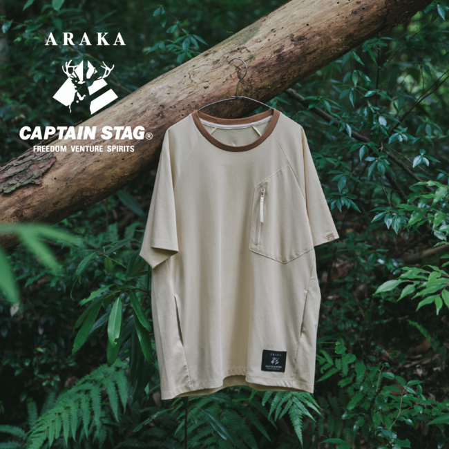 ARAKA YAMAGIとは、ARAKAからこの夏の販売開始後、1ヶ月で累計1,000枚販売を記録した大人気Tシャツです。吸湿速乾、防シワ加工の他、虫除け加工や接触冷感など全部で7つの機能を持った多機能Tシャツで、オールシーズンご着用いただけます。今回のコラボでは、限定ベージュカラーのARAKA YAMAGIの背面に、コラボロゴのデザインをあしらいました。