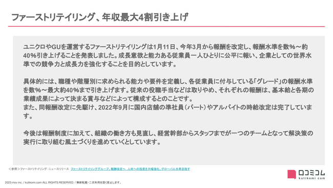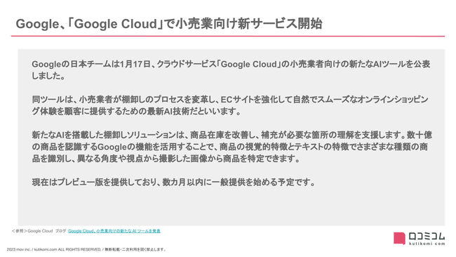 【無料】飲食業界まとめをくわしく見る→https://academy.kutikomi.com/whitepapers/202301_insyoku/?utm_source=pressrelease&utm_medium=prtimes&utm_campaign=202301_matome■ 小売業界動向まとめ:「Google Cloud」小売業向け新サービス / ファーストリテイリング、年収4割引き上げ 他