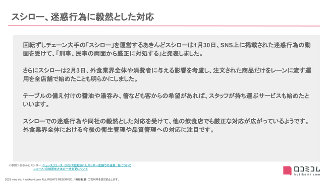 2023年1月はスシローがSNS上の迷惑行為に毅然とした対応をとったことが話題となりました。また、訪日外国人消費がコロナ前の5割にあたる5,952億円まで回復し、日本人宿泊数は「コロナ前超え」するなど、順調にインバウンド回復やコロナ明けの消費に期待がもてるニュースが続きました。