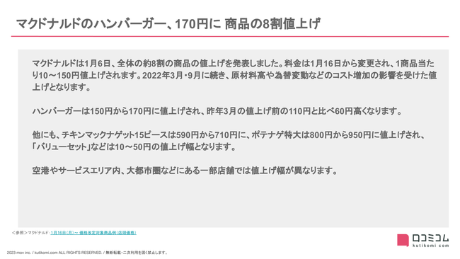 飲食業界まとめ→ https://academy.kutikomi.com/whitepapers/202301_insyoku/?utm_source=pressrelease&utm_medium=prtimes&utm_campaign=202301_matome小売業界まとめ→ https://academy.kutikomi.com/whitepapers/202301_retail/?utm_source=pressrelease&utm_medium=prtimes&utm_campaign=202301_matome宿泊・観光業界まとめ→ https://academy.kutikomi.com/whitepapers/202301_hotel/?utm_source=pressrelease&utm_medium=prtimes&utm_campaign=202301_matomeSNSニュースまとめ→ https://academy.kutikomi.com/whitepapers/202301_sns/?utm_source=pressrelease&utm_medium=prtimes&utm_campaign=202301_matome■ 飲食業界動向まとめ:マクドナルド、ハンバーガー170円に / スシロー、迷惑行為に毅然と対応 他