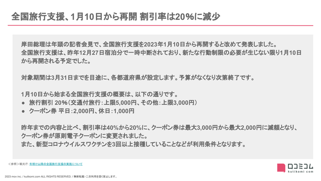 【無料】小売業界まとめをくわしく見る→ https://academy.kutikomi.com/whitepapers/202301_retail/?utm_source=pressrelease&utm_medium=prtimes&utm_campaign=202301_matome■ 宿泊・観光業界動向まとめ:全国旅行支援、10日から再開 / 日本人宿泊数「コロナ前超え」他