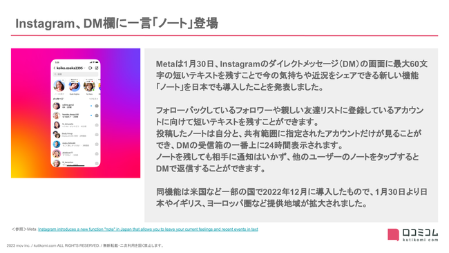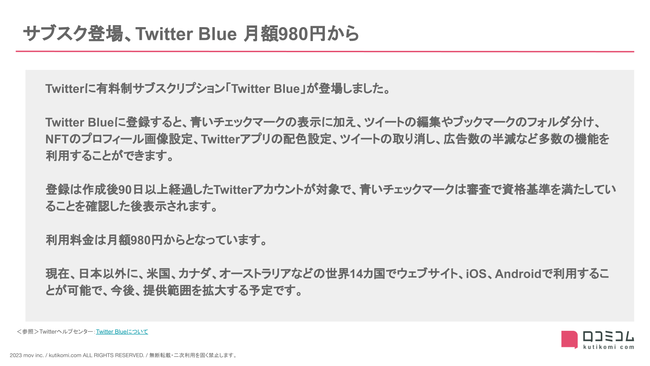 【無料】宿泊・観光業界まとめをダウンロードする→ https://academy.kutikomi.com/whitepapers/202301_hotel/?utm_source=pressrelease&utm_medium=prtimes&utm_campaign=202301_matome■ SNSニュースまとめ:Twitter Blue 月額980円から / Instagram、DM欄に一言「ノート」登場 他