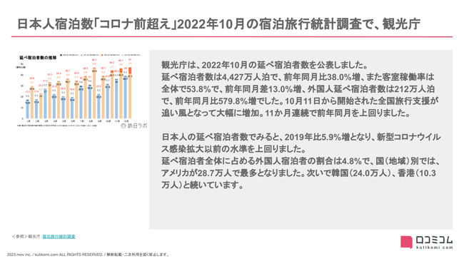 日本人宿泊数「コロナ前超え」まで回復: 飲食、小売、宿泊・観光、SNSの各業界ニュースを網羅!業界動向まとめレポートを口コミコムが公開【2023年1月版】