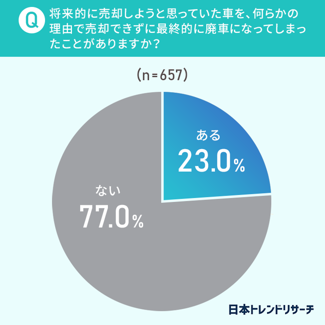 また、23%の方が将来的に売却しようと思っていた車が「売却できずに廃車になってしまったことがある」と回答しました。