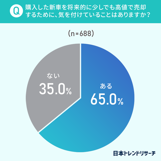 新車を購入したことがある50.2%の方が、購入した新車に乗る際、将来的には売却することを考えて乗っていると回答し、そのうち65%の方が、将来的に少しでも高値で売却するために気を付けていることがあるようです。