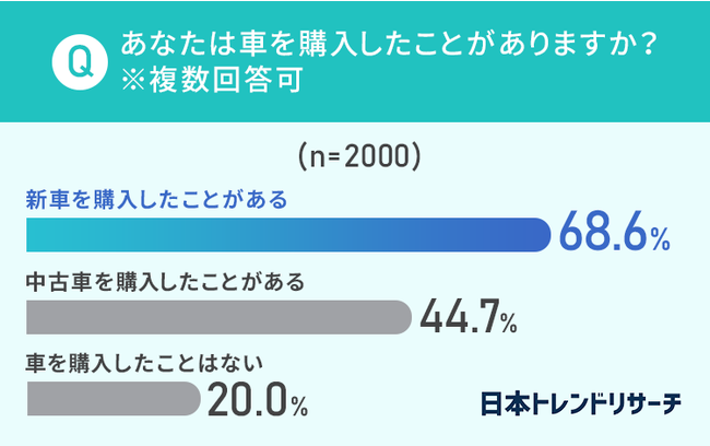 68.6%が「新車を購入したことがある」、44.7%が「中古車を購入したことがある」と回答しました。