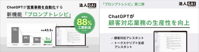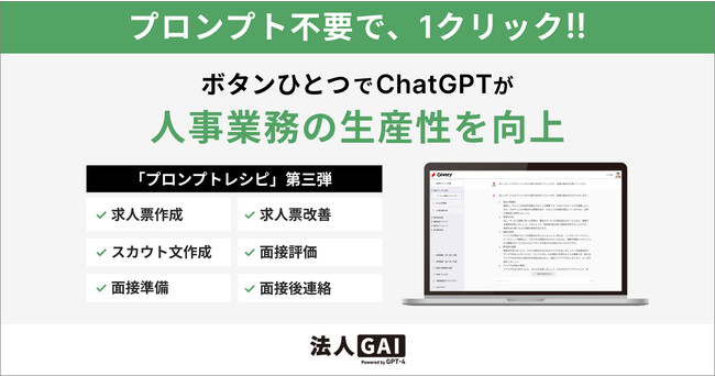 法人・行政向け業務改善ツール、AIチャットボット、AI-FAQなどを提供する株式会社ギブリー(本社:東京都渋谷区、代表取締役社長:井手高志、以下当社)は、「法人GAI powered by GPT-4(法人・ジーエーアイ、以下法人GAI)」に、ボタン一つで業務効率化できるプロンプトレシピの第三弾として、人事向けの「求人票作成アシスタント」「求人票改善アシスタント」「スカウト文作成アシスタント」「面接準備アシスタント」「面接評価アシスタント」「面接後連絡アシスタント」の提供を開始したことをお知らせします。