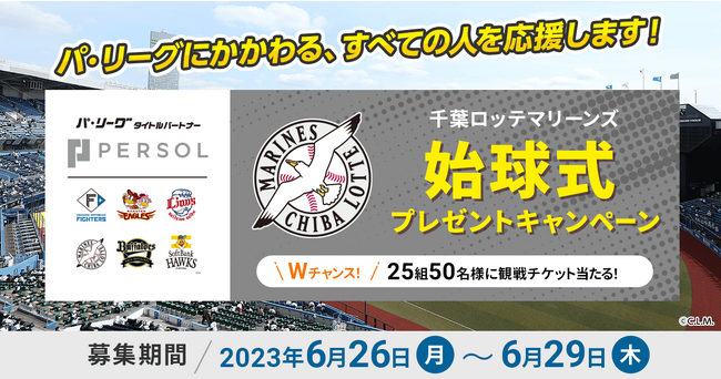 パシフィックリーグマーケティング株式会社(本社:東京都中央区、代表取締役CEO:根岸 友喜)は、2023年度パシフィック・リーグのタイトルパートナーで「はたらいて、笑おう。」をグループビジョンに掲げる総合人材サービスのパーソルホールディングス株式会社(本社:東京都港区、代表取締役社長 CEO:和田 孝雄)とともに、パーソルグループの冠協賛試合「パーソルDAY」の始球式投球権のプレゼントキャンペーンの募集を開始することをご案内いたします。