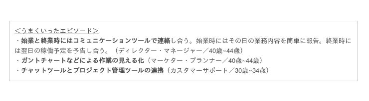 円滑なテレワーク運用には、年代などに応じて抱きがちなストレスをフォローすること、メンバー間で「仕事の定義」を揃えることなどが有効か