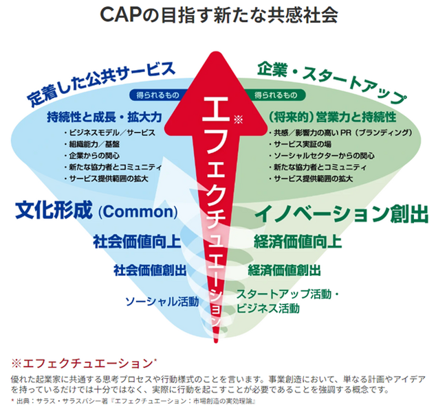スタートアップの目指す新たな経済価値創出に向け、自社ソリューションに合うソーシャル活動と関与することは、営業力強化とPR効果、未開拓協力者の獲得に繋がり、その実現を加速すると考えます。また、ソーシャル活動においても公共サービス化に向けた文化・慣習の浸透を目指す上で企業と関与することは、ビジネス視点でのサービス展開や経済コミュニティとの繋がりなど活動力の拡大に寄与し、その実現を加速すると考えます。