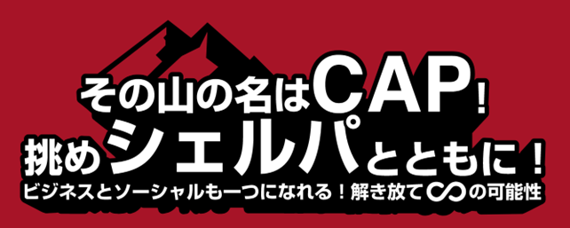 山頂のフラッグを目指し、CAPという名の山をシェルパ(メンター・事務局及びスペシャルメンターの呼称)とともに登ろうと意図したスローガン「その山の名はCAP!挑めシェルパとともに!〜ビジネスとソーシャルも一つになれる!解き放て∞(無限大)の可能性〜」を掲げています。