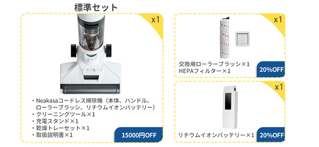 電動モップクリーナーの標準セット+HEPAフィルター+ローラーブラシ、標準セットは標準セット15000円off、更にHEPAフィルター+ローラーブラシを20%の割引で手に入る、9月25日(日曜)まで