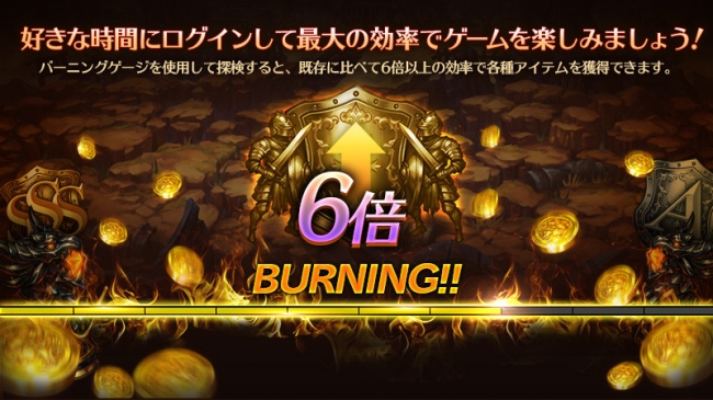 「バーニングゲージ」とは、短時間で高効率の狩りをサポートするシステムです。通常ダンジョンでの冒険の際に自動的に適用され、ゴールド、仲間、アイテムの獲得率が大幅に上昇いたします。