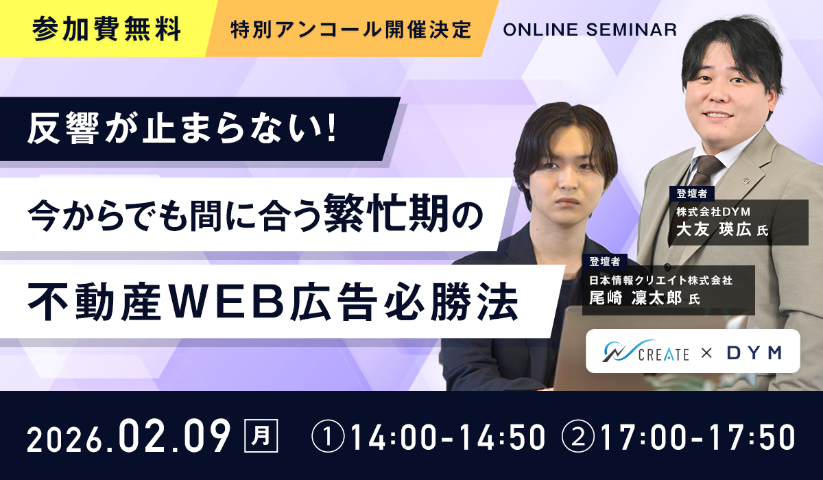 不動産テックを推進する日本情報クリエイト株式会社(本社:宮崎県都城市、代表取締役社長:辻村 都雄、証券コード:4054)は、2026年2月9日(月)に無料オンラインセミナー(以下ウェビナー) 『反響が止まらない!今からでも間に合う繁忙期の不動産WEB広告必勝法』をアンコール開催いたします。