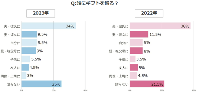 バレンタインギフトを贈る相手としては、“夫・彼氏”がトップとなった一方で、“贈らない”という人も25%と、高い割合でいることがわかりました。 昨年との比較だと“贈らない”と言う人が21.5%→25%と、微増していますが、全体としてはほぼ変動がないと言えます。