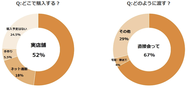 バレンタインの時期には百貨店等に様々なチョコレートブランドが一同に会する催し物が行われたり、実店舗でしか購入できないものなどもあり、まだまだ実店舗派が多いと思われます。 また、渡す方法に関しては、ネット通販で購入した人でも、直接派が多いようで、7割近くの人が“直接会って”と回答しました。