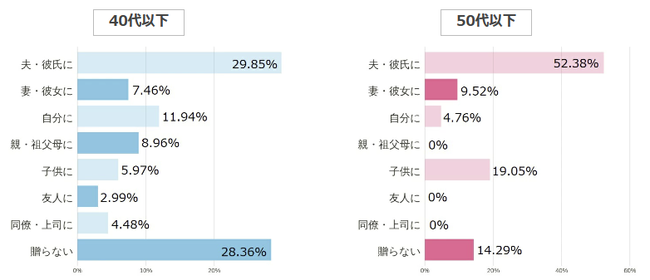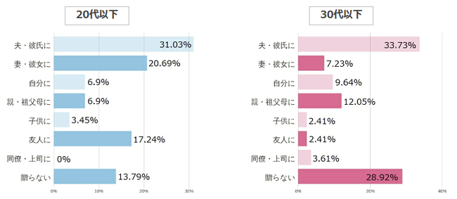 年代別に見ていくと、どの世代でも“夫・彼氏に”がトップではあるものの、“妻・彼女に”贈る割合が、20代以下では他の世代の倍の数値となりました。 また、“友人に”贈るという割合も、他の世代が3%以下であるところ、若い20代以下の世代では17%にも登っています。 このことから、バレンタインというイベントが“女性から男性へ”というものだという意識が、年齢が若いほど薄れていると考えられます。