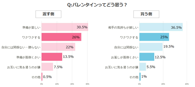 バレンタインに対して、実際にどのように思っているのかを聞いたところ、“渡す側”としては準備が楽しい・ワクワクするなどの肯定的な感情が56.5%と、半数以上という結果に。 貰う側としても、相手の気持ちが嬉しい・ワクワクするなどの肯定的な感情が61.5%と半数以上となりました。