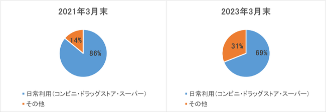 2年間で約10倍となり、2023年3月末時点で、約2件に1件はVisaのタッチ決済で行われています。ドラッグストア、スーパーについても、それぞれ約12倍、約5倍となっています。また、ご利用いただいている加盟店セグメントにおいても、2021年3月末時点では、日常利用(コンビニ、ドラッグストア、スーパー)がVisaのタッチ決済の全取引件数の86%を占めていましたが、2023年3月末時点では、日常利用以外の加盟店セグメントが全体の31%を占めるなど、利用の幅が広がってきていることがうかがえます。また、Visaのタッチ決済の取引件数も、例えば、「ディスカウントストア」は約100倍、「家電量販店」が約38倍にまで増えています。