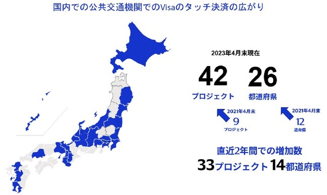 また、最近では、Visaのタッチ決済の公共交通機関での導入や発表も相次ぎ、2021年3月末では、11道府県8プロジェクトであったものの、2023年4月末では、26都道府県42プロジェクトと、急速に拡大しています。