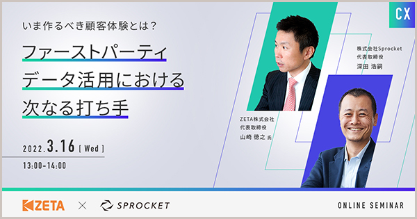 EC商品検索・レビュー・OMOソリューションを開発販売するコマースとCXのリーディングカンパニーであるZETA株式会社(本社:東京都世田谷区、以下ZETA)は、株式会社Sprocket(本社:東京都目黒区、以下Sprocket)と共同で2022年3月16日(水)に無料オンラインセミナー『いま作るべき顧客体験とは?〜ファーストパーティデータ活用における、次なる打ち手〜』を開催いたします。