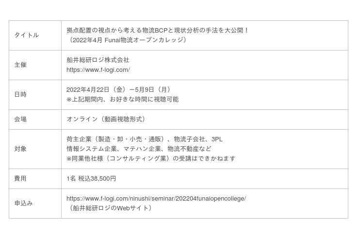ロジスティクス・物流コンサルティングサービスを提供する船井総研ロジ株式会社(東京本社:東京都千代田区、代表:菅重宏、以下「船井総研ロジ」)は、荷主企業(製造・卸・小売・通販)物流担当者が対象のセミナー「拠点配置の視点から考える物流BCPと現状分析の手法を大公開!」を開催いたします。