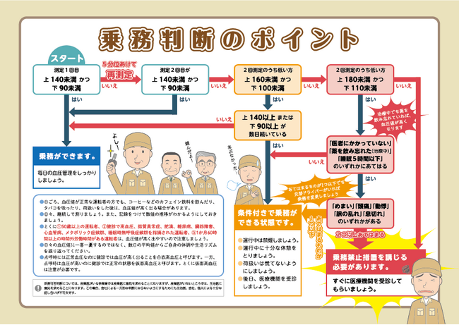 全日本トラック協会から点呼における血圧測定のガイドラインが配布されています。日々血圧をチェックすることが推奨され、乗務可否の業務フローも示されています。