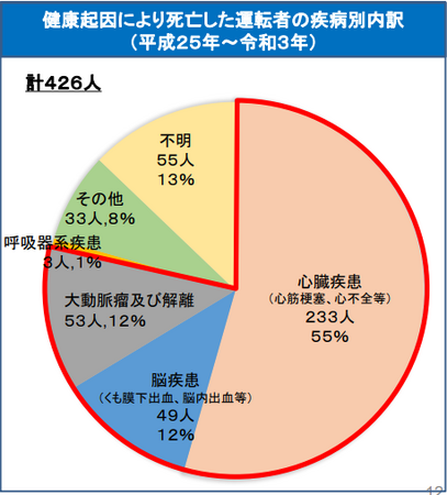 過去9年間で健康起因事故を起こした運転者2,465人のうち心臓疾患、 脳疾患、大動脈瘤及び解離が32%を占めています。うち、死亡した運転者426人の疾病別内訳は、心臓疾患が55%、脳疾患が12%、大動脈瘤及び解離が12%を占めています。