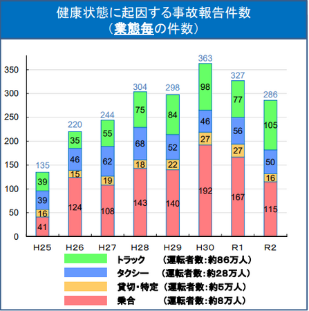 運輸業界ではドライバーの健康起因による事故が減少傾向にありますが、直近の統計 R2→R3 は、やや増加しました。もっとも多いのは乗合バスのドライバーです。次いでトラックドライバーの順ですが、トラックは過去最多となっています。
