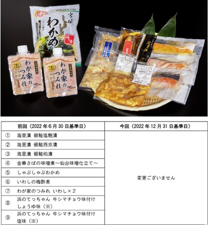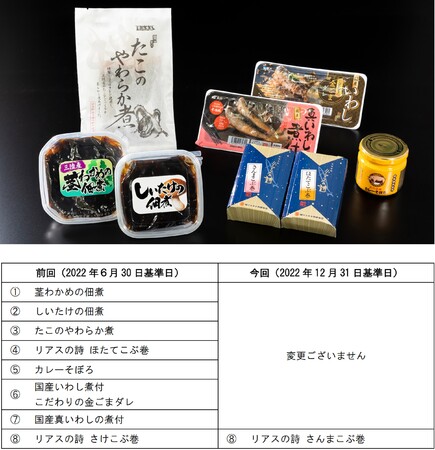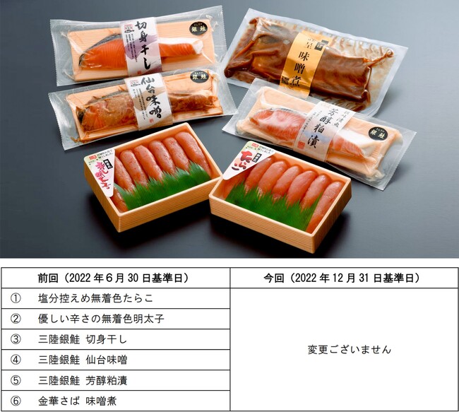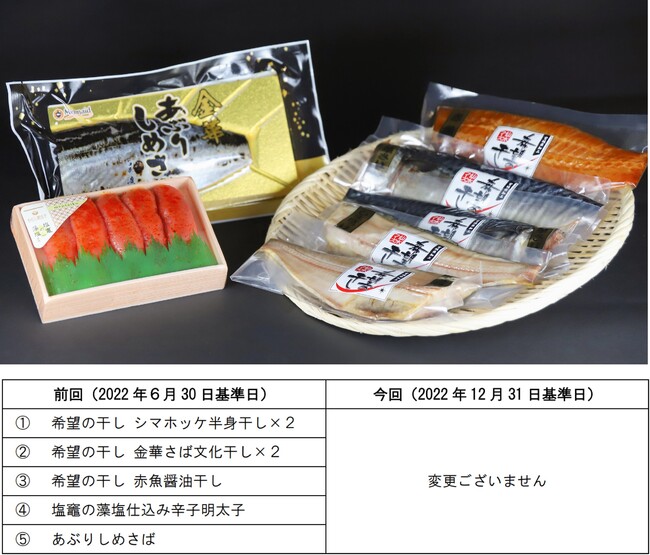 当社は、現在、年4回実施しております株主優待のうち、6月30日および12月31日を基準日とする株主優待は東日本大震災の復興支援を目的として、東北地方の名産品詰め合わせ[商品3,500円相当 ※ 送料1,400円相当は当社負担]をお送りしており、現在までに累計約30万1千セットを株主の皆様にお届けしております。2022年12月31日基準日の株主優待については、ご好評いただいているラインナップをもとに一部商品を入れ替え、株主の皆様の声にお応えできるよう、さらに趣向を凝らしたセット内容としましたので、下記のとおりお知らせいたします。