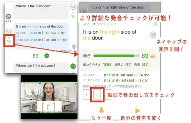 また、フレーズの横のマイクマークをタップすると、より詳細な発音チェックが可能です。間違えた音素は30秒ほどの動画で音の出し方をチェック!自分の音声とネイティブ音声を聴き比べて何度も練習することで、発音矯正が可能です。