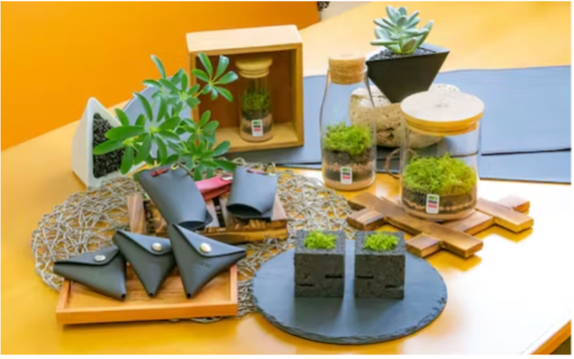 ウレタンについては帯広畜産大学とともに微生物により廃材を分解する方法を研究し、保水性にすぐれる新素材を開発。これにより土を代替し、観葉植物とセットのインテリアとして商品化。コケの特産化を目指している島根県江津市と組み、コケを使った商品も用意した。本革の端材はコインケースのほか、キーケース、名刺入れ、パソコンなどが置けるデスクマットとして活用しています。