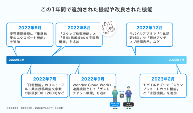 8周年から9周年までの1年間においても、「日報機能のリニューアル」や「スタンプ検索機能の追加」、「Wonder Cloud Works連携機能として“ゲストチャット機能”を新規リリース」など、WowTalkの利便性を向上させるために様々な機能の追加や改良を実施してまいりました。