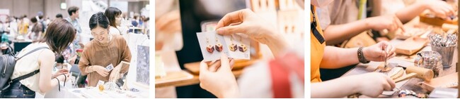 会場内には、アクセサリーやバッグなどのファッションアイテムからインテリア、キッチン、アート、器、手工芸品など、全国各地で活躍するクリエイターがオリジナル作品を展示・販売するマーケットや、伝統工芸士や人気クリエイターのものづくりを体験できるワークショップが集まる「クリエイターエリア」、注目アーティストのアコースティックライブを心地よい空間で楽しむことができる「ミュージック&カフェエリア」、日本各地から選りすぐりの手作りフードが集まる「フードエリア」に分かれ、ここでしかできない体験を通して五感でクリエイティビティを体感できる空間となります。