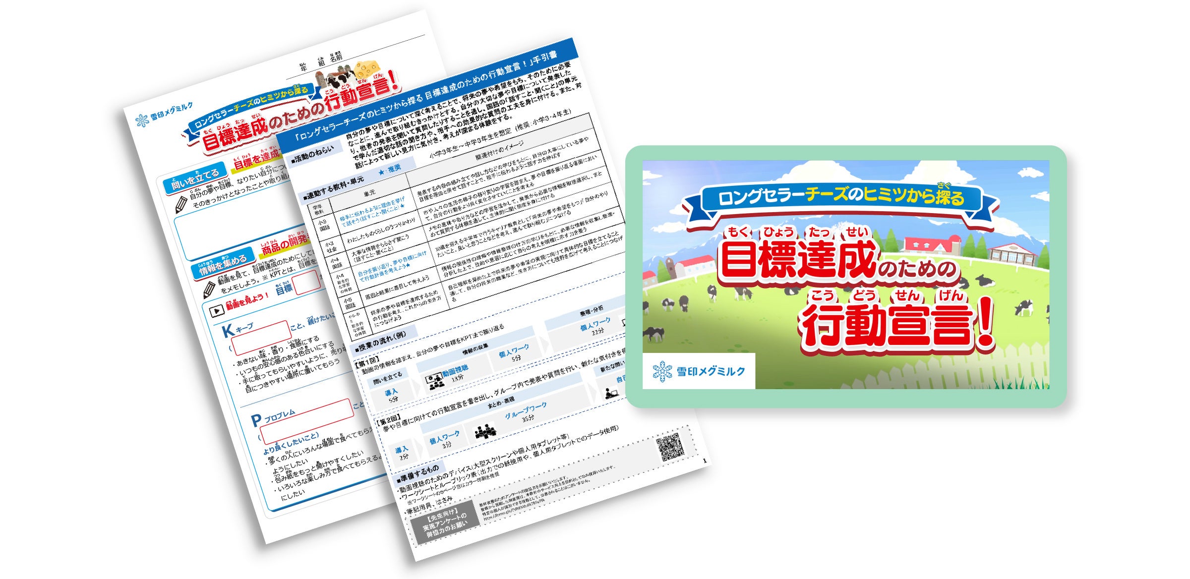 本プログラムでは、自分の夢や目標を考えるとともに、雪印メグミルクが販売する「6Pチーズ」が70年以上支持されるために継続してきた取り組みを知り、目標達成に向けた行動を自ら設計するプロセスを体験します。例えば小学校4年生の総合的な学習の時間にある「夢や目標に向けて行動計画を考えよう」や、小学校3・4年生国語の学習指導要領にある「相手に伝わるように理由を挙げて話そう」、「大事な情報をもらさず聞こう」に紐づく単元等と連動して、思考・判断・表現力を育むプロセスを実践できる探究学習を提供いたします。