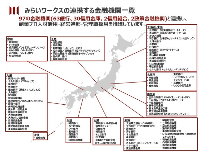 プロフェッショナル人材のフリーランス・副業といった多様な働き方をサポートする株式会社みらいワークス(本社:東京都港区、代表取締役社長:岡本祥治、証券コード:6563、以下「当社」)は、株式会社愛知銀行(本店:愛知県名古屋市、取締役頭取:伊藤行記、以下「愛知銀行」)と人材支援による地域企業の事業強化を目的とした業務提携契約を締結したことをお知らせいたします。また、今回の愛知銀行との提携をもって、97の地域金融機関と地方転職・副業人材の活用を推進することとなります。