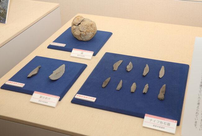 同じく入口付近には、旧石器時代の遺跡である郡家今城遺跡から出土した、当時、狩猟する際に使ったと考えられている石器やその材料となる翼状剥片が展示されていて、これらは大阪府指定有形文化財に登録されています。