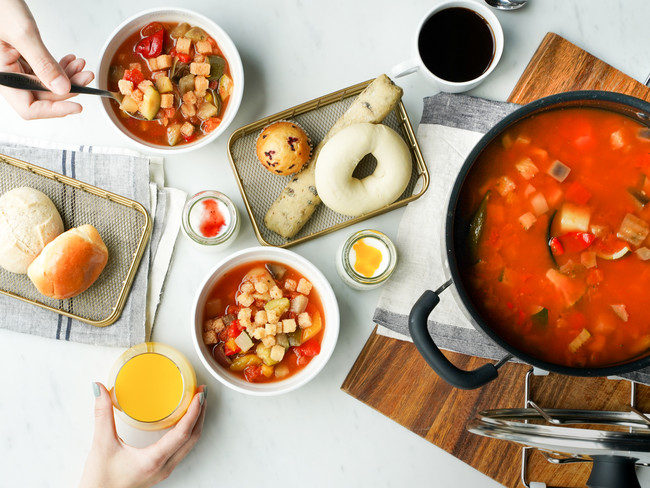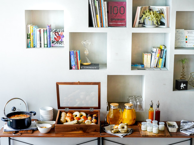 The Millennialsでは、これまでは簡易的な朝食を提供しておりましたが、ゲストの皆様の滞在がより充実したものになるように、朝食付きプランをご用意しました。メニューは、スープ&パンをメインに、デザートにはヨーグルト、オレンジやアップルジュース付きのライトビュッフェスタイル。スープは具だくさんのミネストローネや濃厚なクラムチャウダーなど日替わりで提供いたします。パンはフランスから直輸入のハード系のパンや日本産のソフト系のパン、スイーツ系はチョコフィリング入りのドーナツなど5種類の中から2種類を選ぶことが可能です。スープとジュースはおかわり自由、ラウンジのコーヒーマシーンもご利用いただけます。
