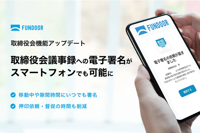 株式会社FUNDINNO(本社:東京都品川区、代表:柴原 祐喜/大浦 学、以下「当社」)は、株主管理・経営管理プラットフォーム「FUNDOOR(ファンドア)」の取締役会機能のアップデートにおいて、スマートフォンでの取締役会議事録への電子署名が可能になったことをお知らせいたします。