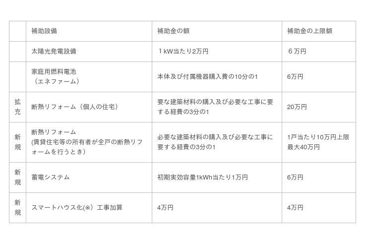 「スマートハウス支援補助金」と「ZEH支援補助金」から成り、それぞれにおいて補助対象となる設備の設置や、住宅の新築または改修に対して補助金を交付します。