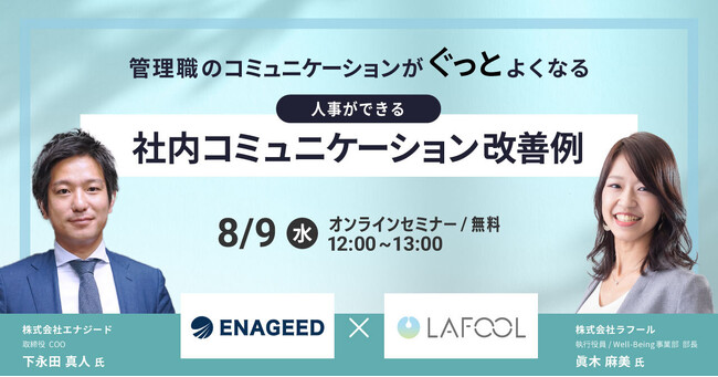 「個人が変われば、 組織が変わる」組織改善サーベイ「ラフールサーベイ」を提供するウェルビーイング/人的資本経営支援の株式会社ラフール(本社:東京都中央区、代表取締役社長:結木啓太、以下「ラフール」)は株式会社エナジード(本社:東京都新宿区、代表取締役:氏家光謙、以下「エナジード」)と『管理職のコミュニケーションがグッとよくなる。人事ができる社内コミュニケーション改善例』をテーマとしたセミナーを2023年8月9日(水)に開催します。