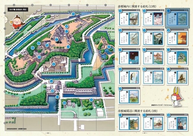 郷土かるたである「彦根かるた」や、彦根の「ご当地キャラクター」達が描かれ、かるたの絵札と学生たち自身で考えた解説に加え、対応する地図・写真が掲載されております。また、彦根をめぐる「彦根かるたスタンプラリー」も冊子に同封されており、市内4か所の観光案内拠点に設置されたご当地キャラクターのオリジナルスタンプが収集できるとともに、彦根の魅力を再発見し地域活性化に繋がる冊子となっています。