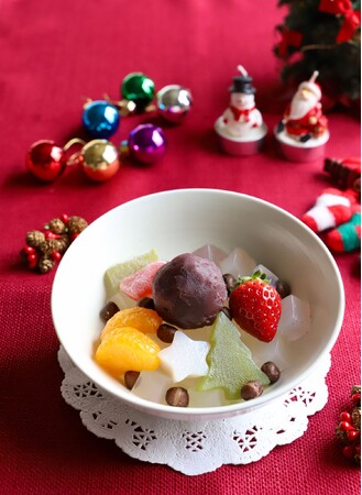 クリスマスツリー型の抹茶羊羹や星の形をしたくず餅、イチゴなどフルーツをトッピングしたクリスマス仕様の限定あんみつです。和のクリスマスをお楽しみください。